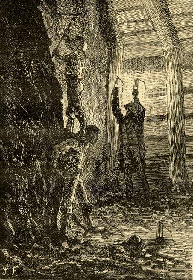 Klokken slog 12 paa det gamle Stueur, da James Starr og hans Ledsagere forlod „Cottagen”. Dagslyset, som svagt trængte ned gennem Ventilationsskakten, overflødiggjorde næsten Lamperne; men det vilde ikke vare længe, thi det var den gamle Overstigers Hensigt, at føre Ingeniøren helt over til Dochart Grubens fjerneste Ende.
