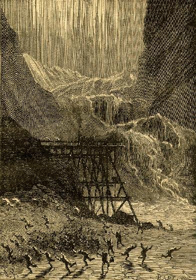 I dette Øjeblik hørte man pludselig en forfærdelig Larm. Man skulde have troet, at et frygteligt Vandfald styrtede ind i Kulgruben.
