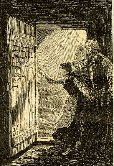 Nell var bleg som et Lig, hendes Ansigt fordrejet, hendes Træk et Billede paa Forfærdelse. Ude af Stand til at tale, stirrede hun paa „Cottagen”s Dør, som hun lige havde aabnet, og hun pegede paa nogle Linjer, som var blevet skrevet her i Løbet af Natten. Det var Synet af dem, der havde rystet hende.