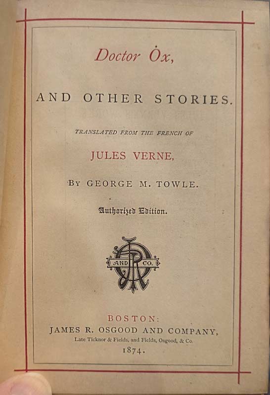 Dr. Ox's Experiment [83] 1874 first US edition, Osgood [84] 1874 first UK edition Green, Sampson Low [85] 1874 first UK edition Purple, Sampson Low [86] 1875 US terra-cotta, Osgood [87] 1875 US green, Osgood [88] 1963 US edition, Macmillan