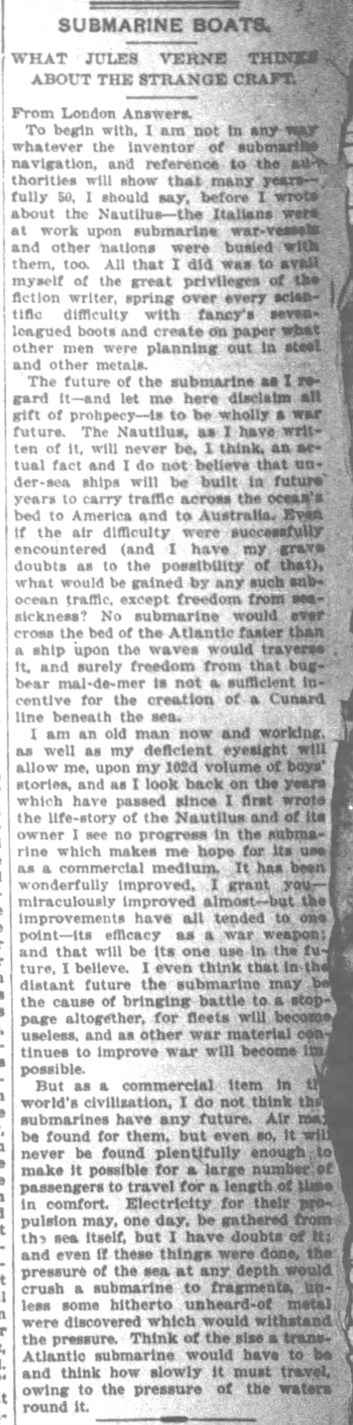 "... To begine with, I am not in any way watever the inventor of Submarine Navigation, and references to the authorities will show that many years -- fully fifty, I should say, before I wrote about the Nautilus -- the Italians were at work upon submarine war vessels, and other nations were busied with them too. All that I did was to avail myself of the great privileges of the fiction writer, spring over every scientific difficulty with fancy's seven-leagued boots and create on paper what other men were planning out in steel and other metals. ..."