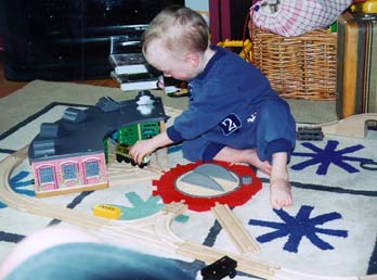 Playing with the Roundhouse that Grandpa Morley gave him.