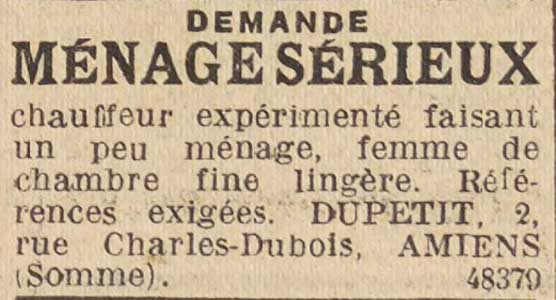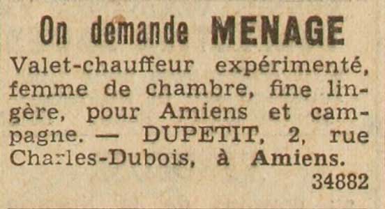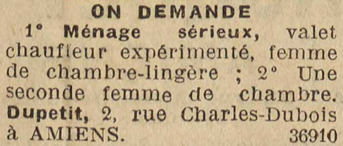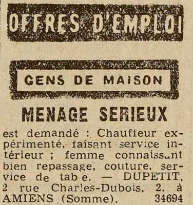 Ad for: Cuisiniere et Valet de chambre ou separement, sont demandes