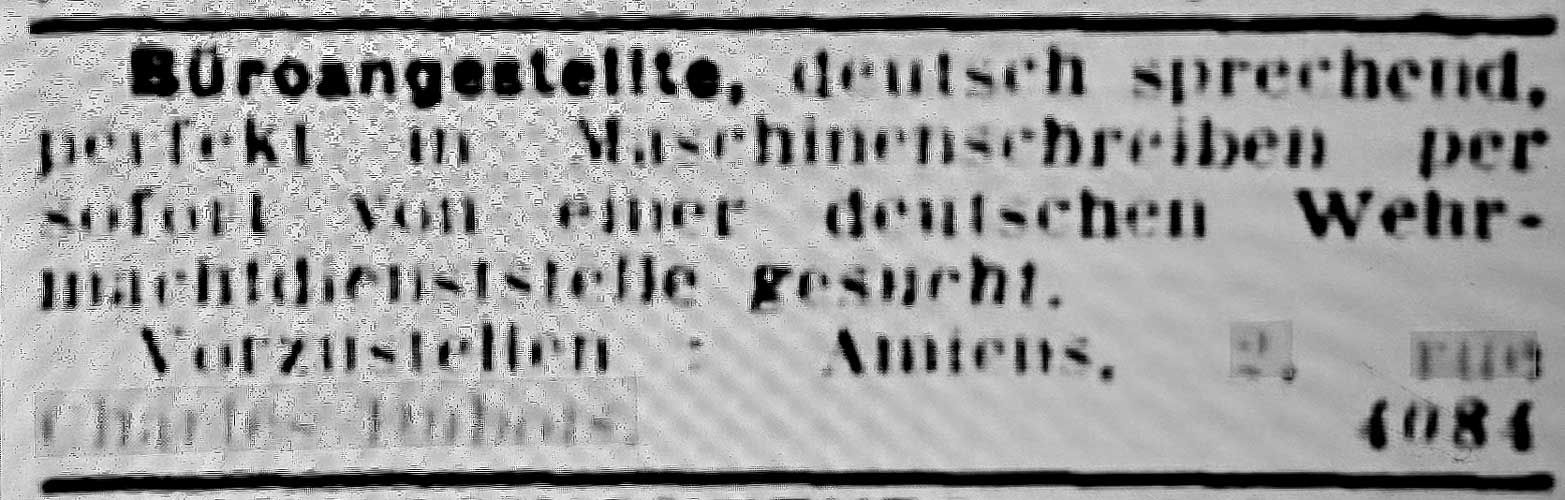Office clerk, German-speaking with Excellent typing skills, sought immediately by a German military machinations agency.