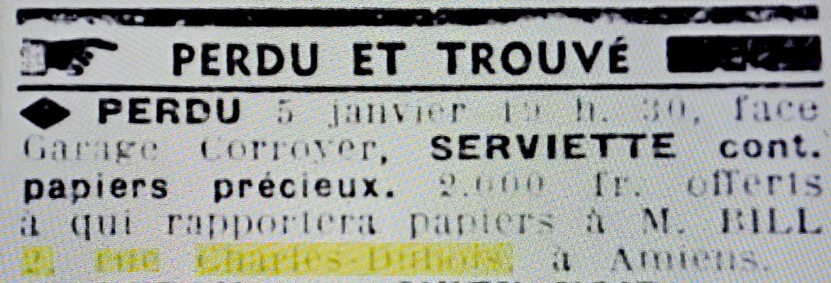 precieux, 2,000 fr. offerts a qui rapportera papiers a M. BILL 2, rue Charles-
