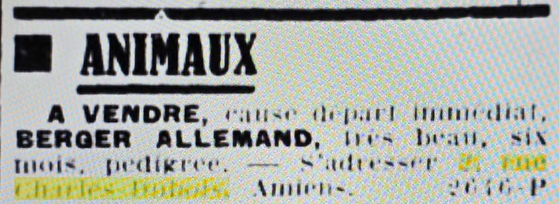 A Vendre, cause depart immediate, Berger Allemand, tres beau, six mois, pedigree -- s'adresser 2, rue Charles-Dubois, Amiens