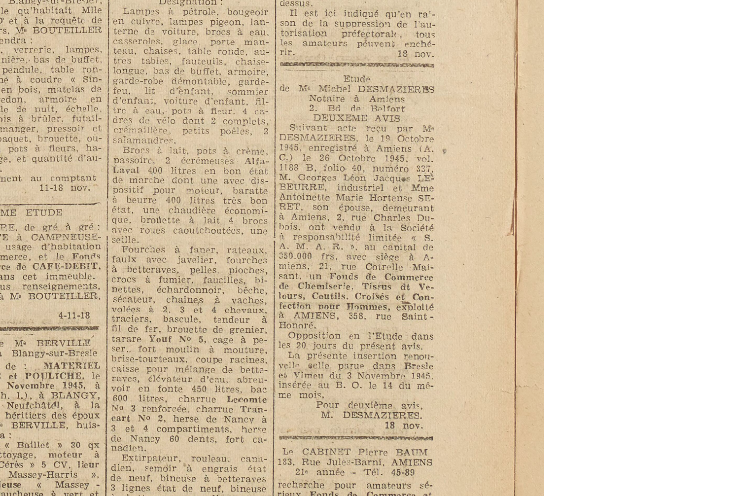 Legal Notice from M. Michel Desmazieres (lawyer): Gives address for M & Mme Lebeurre as 2, ruw Charles-Dubois