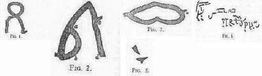 We found the entire length of the third chasm three hundred and twenty yards. At the point a was an opening about six feet wide, and extending fifteen feet into the rock, where it terminated in a bed of marl, there being no other chasm beyond, as we had expected. We were about leaving this fissure, into which very little light was admitted, when Peters called my attention to a range of singular-looking indentures in the surface of the marl forming the termination of the cul-de-sac. With a very slight exertion of the imagination, the left, or most northern of these indentures might have been taken for the intentional, although rude, representation of a human figure standing erect, with outstretched arm. The rest of them bore also some little resemblance to alphabetical characters, and Peters was willing, at all events, to adopt the idle opinion that they were really such. I convinced him of his error, finally, by directing his attention to the floor of the fissure, where, among the powder, we picked up, piece by piece, several large flakes of the marl, which had evidently been broken off by some convulsion from the surface where the indentures were found, and which had projecting points exactly fitting the indentures; thus proving them to have been the work of nature. Figure 4 presents an accurate copy of the whole.