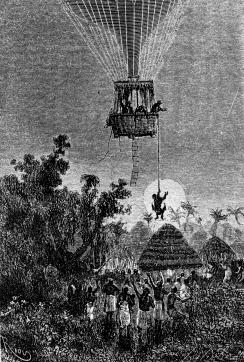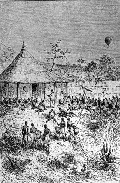 All at once this agitation, movement and noise stopped as though by magic. The balloon had just come in sight, far aloft in the sky, where it hovered majestically for a few moments, and then descended slowly, without deviating from its perpendicular. Men, women, children, merchants and slaves, Arabs and negroes, as suddenly disappeared within the “tembés” and the huts.