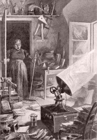 Służba wdowy Thibaut polegała jedynie na sprzątaniu pokoju tego niezrównoważonego uczonego. Ponieważ umeblowanie tego pokoju przedstawiało się więcej niż skromnie, utrzymanie go w porządku nie mogło być porównane do trzynastej pracy Herkulesa. Przytem reszta mieszkania nie należała prawie wcale do jej kompetencji. Szczególnie w drugim pokoju nie wolno jej było bezwzględnie, pod żadnym pozorem dotknąć stosu papierów leżących dookoła, i czynności swej szczotki, stosownie do wyraźnej umowy, ograniczyć musiała do sprzątania małej kwadratowej części podłogi na środku pokoju.