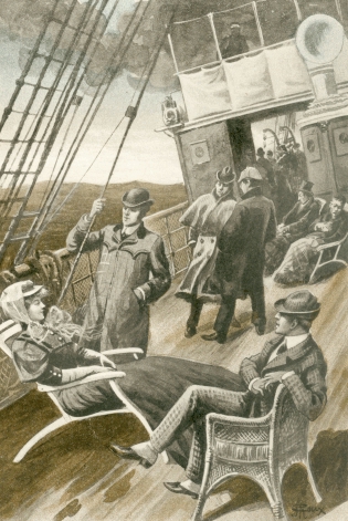 Nie potrzebujemy dodawać, że ich choroba była bardzo na rękę dwojgu narzeczonym. Choroba morska ominęła ich szczęśliwie. To też nie tracili czasu, podczas gdy ich ojciec i wuj poddawali się z jękiem wstrętnym razom zdradliwej Amfitryty. Rozłączali się tylko dla niesienia pomocy chorym. Wszakże czynili to według zgóry ułożonego planu, podzieliwszy obowiązki w ten sposób, że Jenny pocieszała mr. Dean Forsyth’a, gdy Francis Gordon dodawał odwagi słaniającemu się doktorowi.