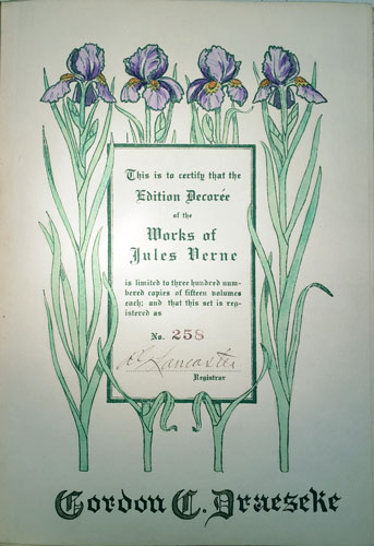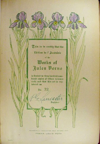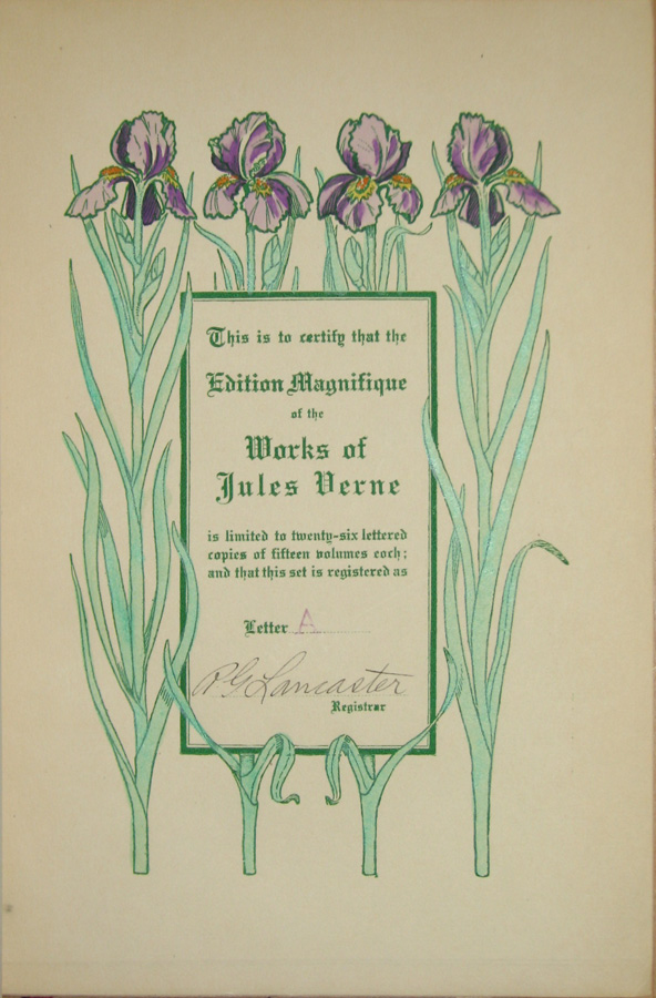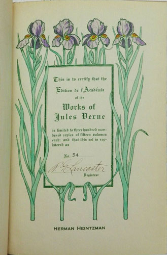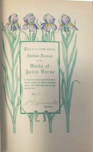 "This is volume xx of a complete set of the works of Jules Verne consisting of fifteen volumes, issued strictly as a limited edition. In volume One will be found a certificate as to the limitation of the edition and the registered number of this set"