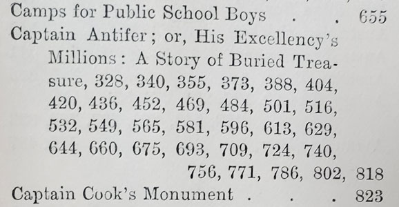 "This work appeared in The Boy's Own as Captain Antifer; or, His Excellency's Millions: A Story of Buried Treasure in issues found in annual volume 17, which covered the period from October 1894 through September 1895."