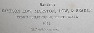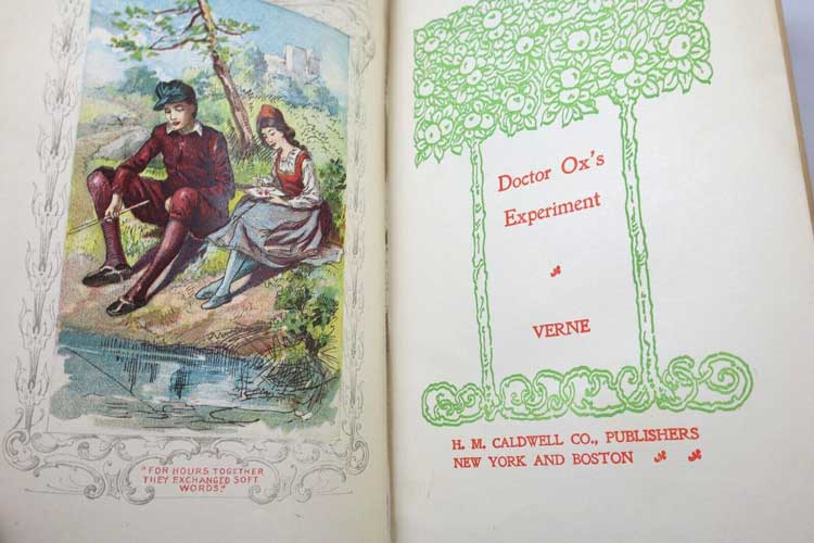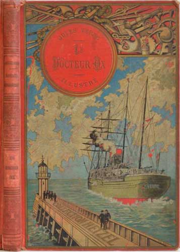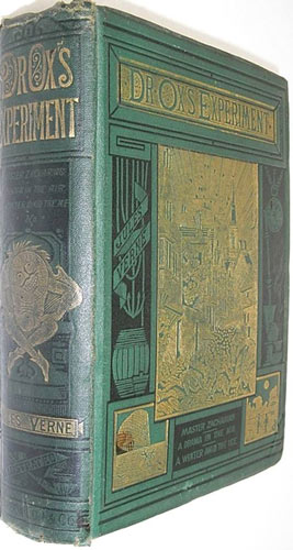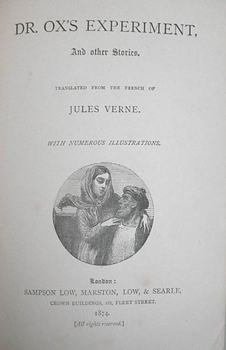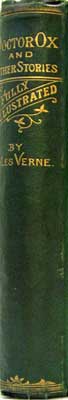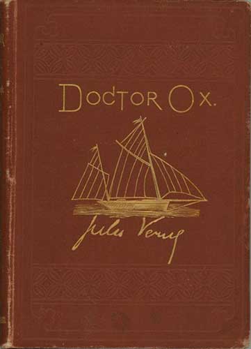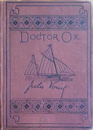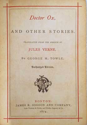 "Commencing on May 22, 1874, for about a month, James R Osgood announced in the New York Commercial Advertiser that Doctor Ox was "In Press," and on June 29, 1874, copyright registration was made, followed by deposit of two copies of the book on July 17. On August 1, 1874, notice appeared in the American Booksellers' Guide that Osgood had published a translation by George M Towle of five of Jules Verne's stories in one volume, with the title of Dr. Ox, and Other Stories. This is an 18mo. book in the Saunterer's Series, which typically has the title, a sketch of Verne's yacht St. Michel, and Verne's signature all embossed on the front cover in gilt."