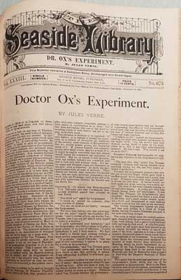 "On June 25, 1874, Charles E. Warburton copyrighted A Fancy of Doctor Ox, although no deposit copies were cited. This translation by Stephen W. White was reprinted from the columns of The Evening Telegraph, and appeared without the other stories, printed in double column format and bound with The Tour of the World in Eighty Days."