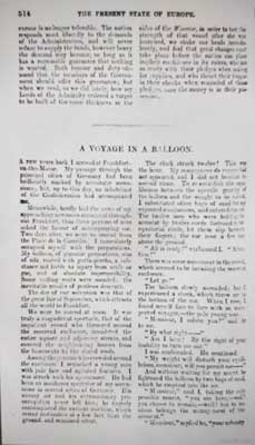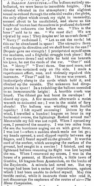AD for & A Balloon Adventure ending The North Devon Journal-Herald The text reads: This is "a weeky magazine of the amusing and the useful," chiefly the former. The part before us opens with "A Voyage in a Balloon," a thrilling narrative of a terrible adventure in the upper regions. The writer ascended from Frankfort, with a madman; who jumped into the car just as the balloon was ascending, being there, as he told the other, "by the right of your inability to turn me out." The aeronaut did not discover the insanity of his companion till they were up high in mid air. Strange scenes were enacted between them. Here is the conclusion: --" |
