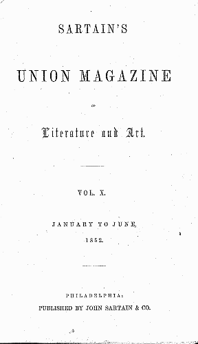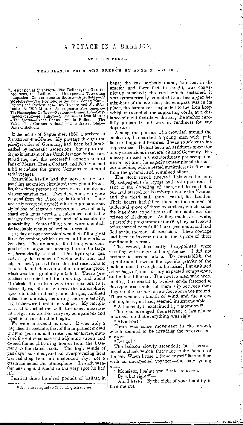 Jules Verne Encyclopedia: A Voyage in a Balloon Vol X, No. 5, Translated from the French by Anne T. Wilbur The Text starts: And ends: Note, though the story itself lists Jules Verne as the author, the index states: "By Anne T. Wilbur" When was the May issue of Sartains available? The May issue was available at least by April 20, 1852 The below Newsstand ad, was published on April 20, 1852, page 4, in the Richmond Dispatch, Richmond Virginia, announcing that the May Sartain's Magazine was now available.
