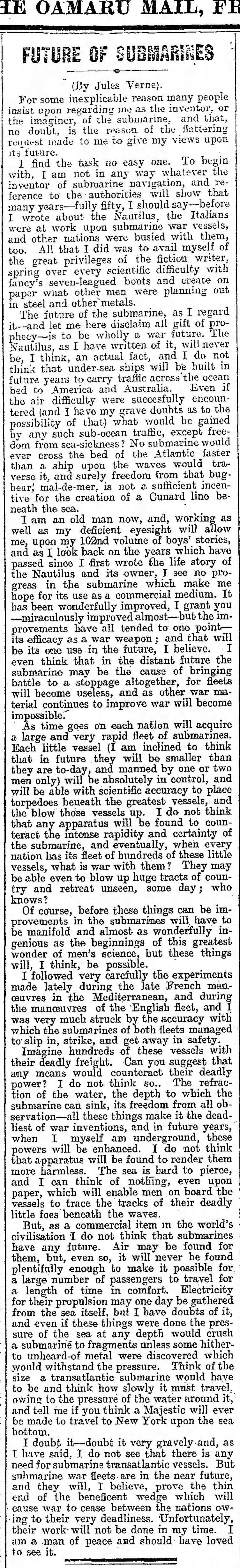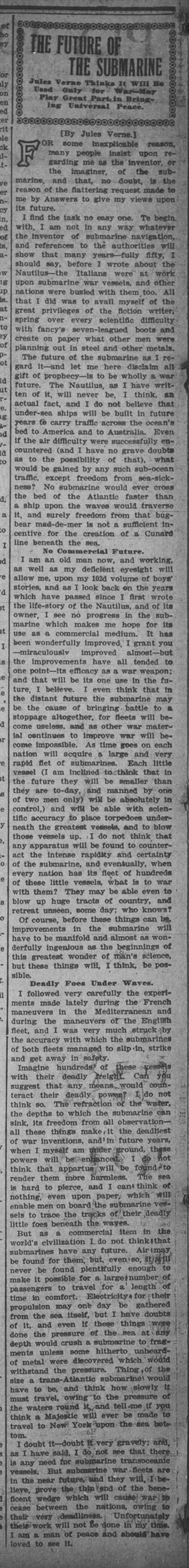 "... To begine with, I am not in any way watever the inventor of Submarine Navigation, and references to the authorities will show that many years -- fully fifty, I should say, before I wrote about the Nautilus -- the Italians were at work upon submarine war vessels, and other nations were busied with them too. All that I did was to avail myself of the great privileges of the fiction writer, spring over every scientific difficulty with fancy's seven-leagued boots and create on paper what other men were planning out in steel and other metals. ..."