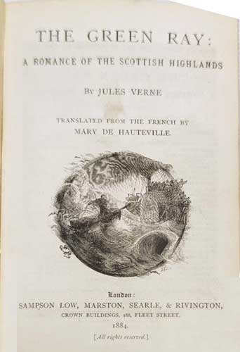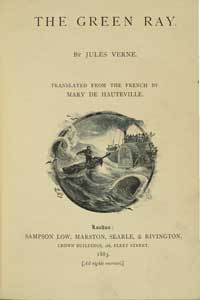 "In September 1883, Sampson Low published the first British edition of The Green Ray, translated by Mary de Hautville, in two crown 8vo. versions, priced at 5s and 6s respectively. The front cover pictures Helena and Oliver with eyes fixed upon each other as a small group standing behind them witness the "Green Ray."