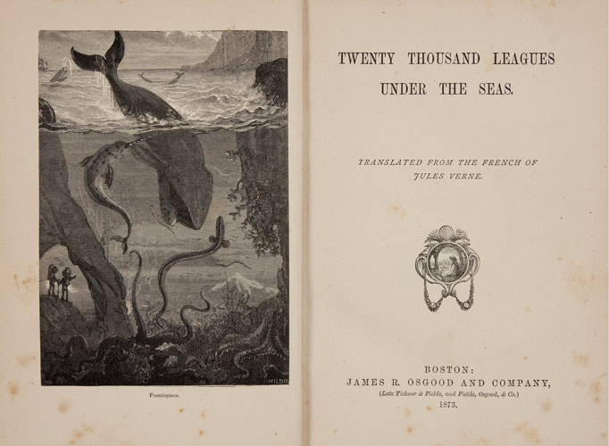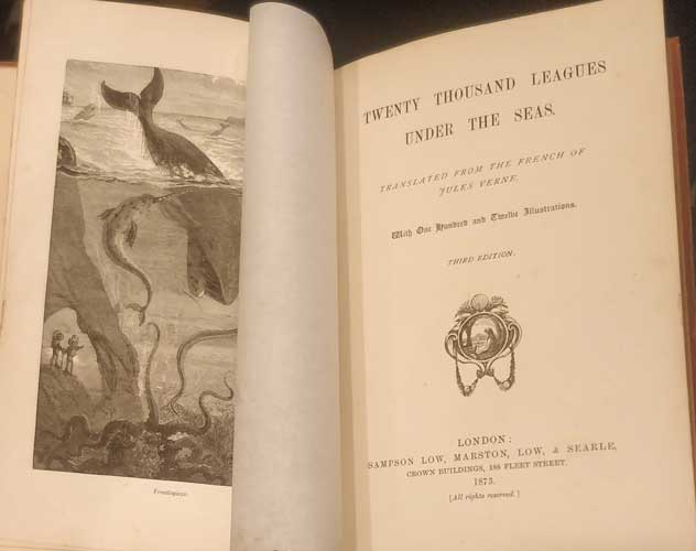 Twenty Thousand Leagues Under the Seas 1875 Sampson Low, Marston, Low, and Searle, Crown Buildings, 188, Fleet Street London Translated from the French of Jules Verne With One Hundred and Twelve Illustrations Seventh Edition All Edges Gilt YES, this volume is purple! Images courtesy of Andrew Cox Rare Books |